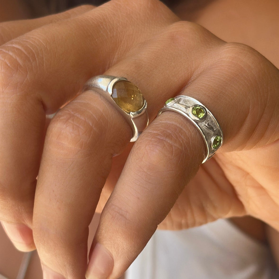 Papyrus ring featuring peridot stone can be ordered with custom stone colours upon request, available in 9k solid yellow gold, sterling silver and gold plating.